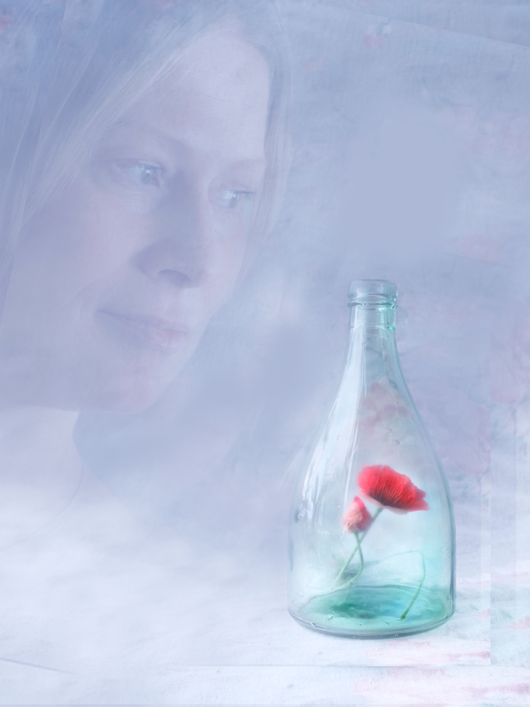 Hi Kirsti, I really love the subtle colours in this image and the almost transparent girl, which really conveys the story of dreamed memories. The poppy in the jar looks so nice, and the red complements the blue tones of the image, adding a touch of colour and visual interest.