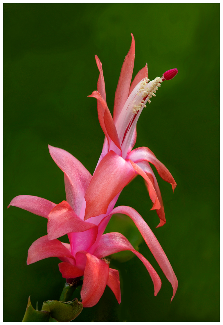 Hi Dick, such a beautiful capture of this Christmas cactus! The red tones stand out beautifully against the green background, and the shape and fine details of the flower are rendered in a way that's very appealing to my eye. The vertical frame suits the shape of the flower perfectly. The only thing that caught my eye and feels a bit distracting is the green stem at the bottom right. |