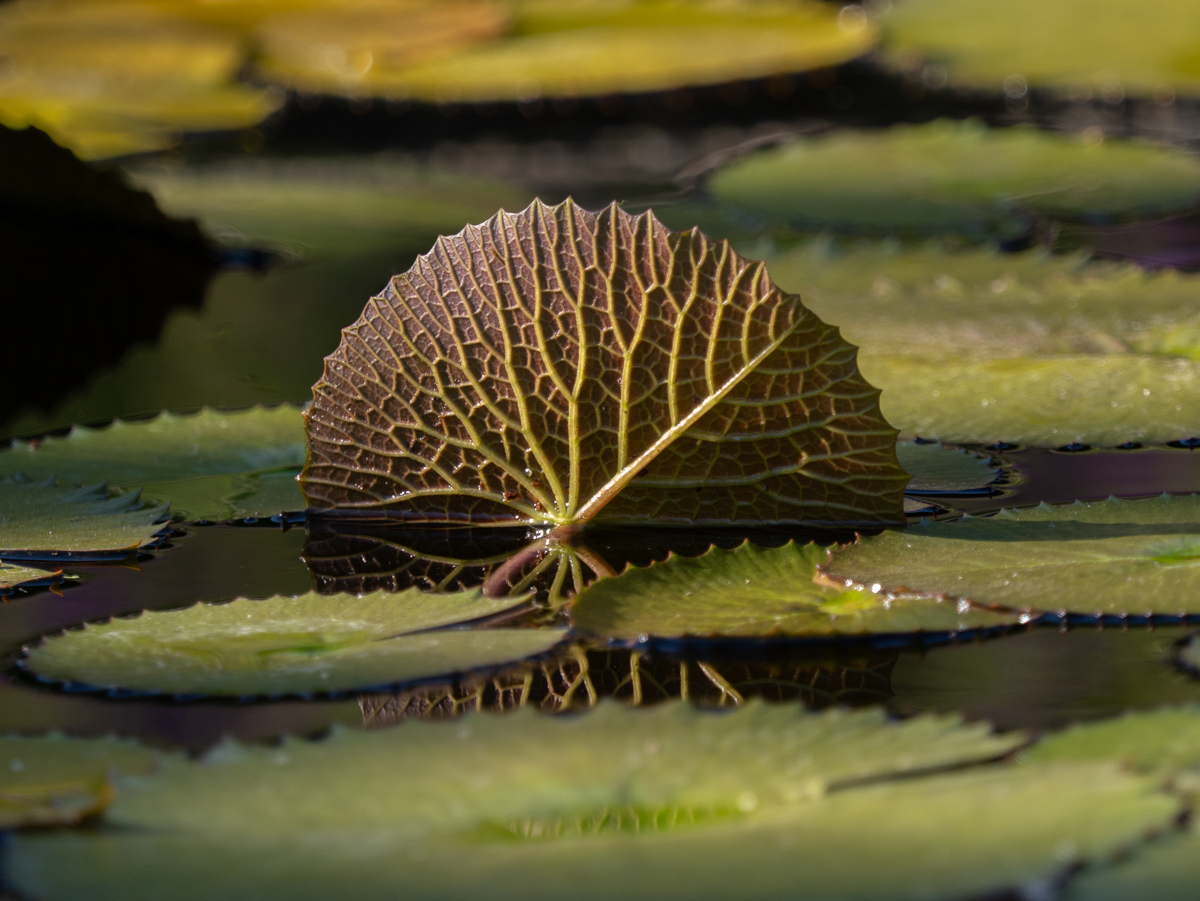 As Dick pointed out, it's not common to see the underside of a water lily, and the way you've captured it reveals all the intricate details of the leaves. The beautiful light and the different shades of green complement the image wonderfully, and the centred leaf creates a strong composition. My only suggestion would be to crop a little at the top, and maybe a bit at the bottom, to avoid distractions. |