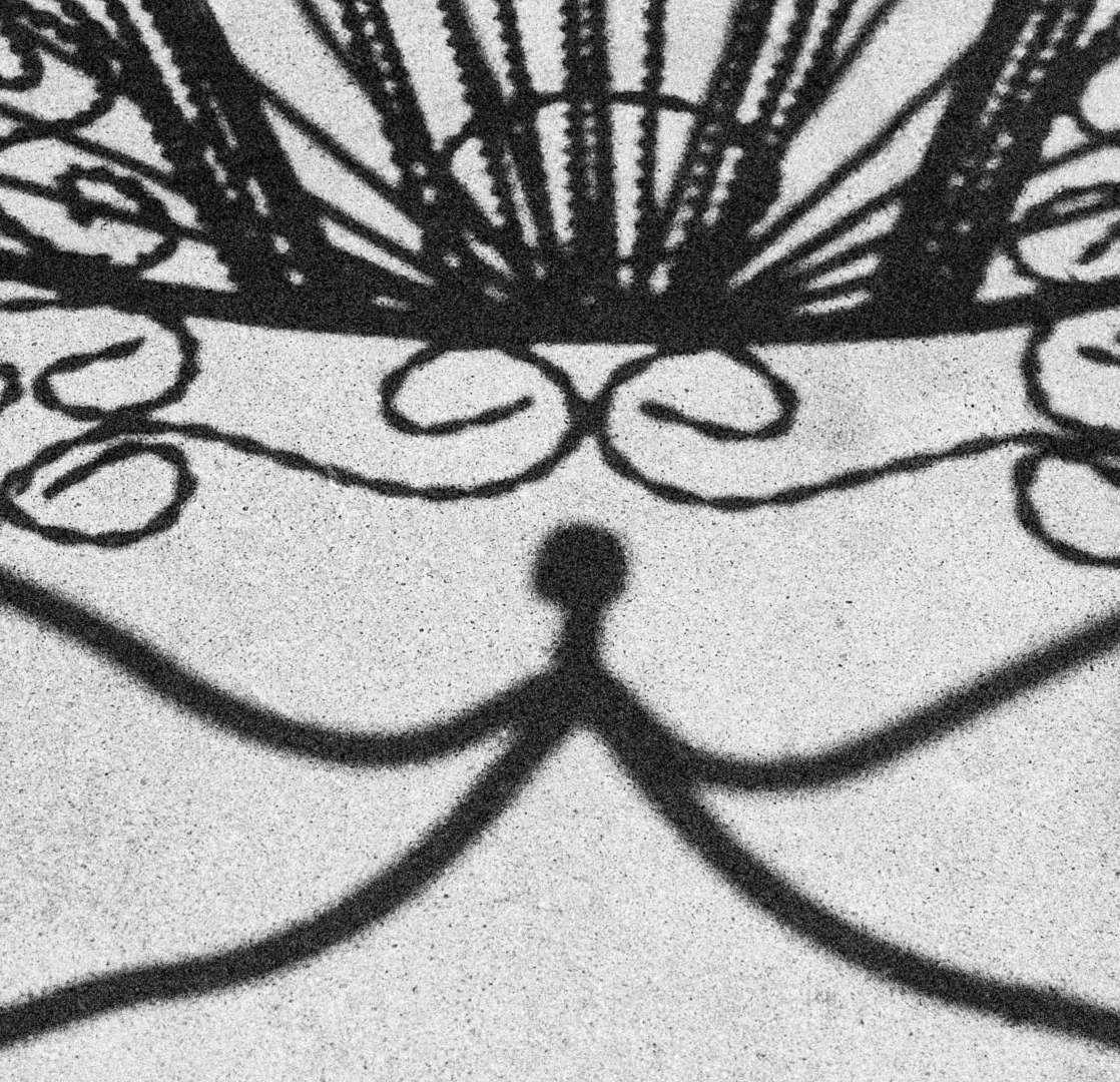 Now for the answer...it is actually the shadow of the back of a chair made from heavy steel wire and strap. I had someone hold it in a position to optimize the shadow for this look and symmetry. It is on concrete, but I added a lot of simulated film grain and added contrast and of course made it fully B&W. |