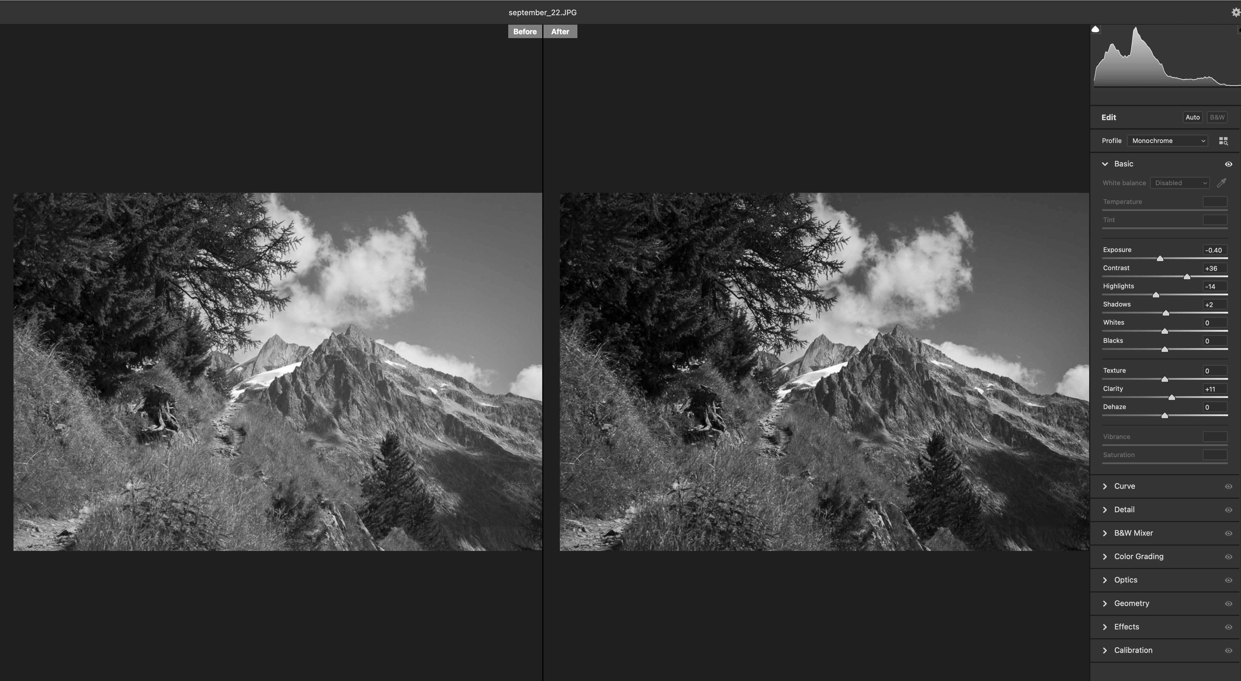 you have a nice lead in line with the path. The mono conversion seems b bit flat as there is lots of mid tones. See attached I increased contras a bit and flipped it around. My suggestion. |