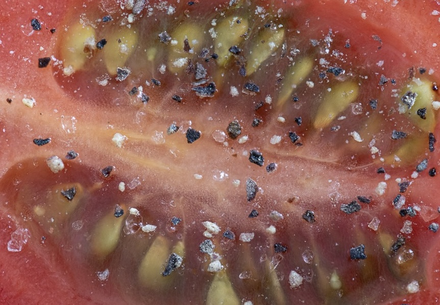 Pat, Interesting image. The magic of everyday things comes alive. My eyes were also drawn to the different shapes of salt and pepper crystals. I wonder if a tighter crop of the tomato without the corners would bring the salt and pepper flakes more at the center of the image. |