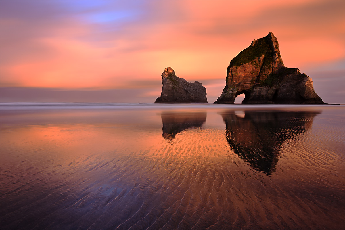 Thanks Mark! This was the fourth time we went here and I had lots of practice with the waves. It really was about timing the incoming waves to see what area the wave was receding and then quickly moving the tripod, composing and shooting. This was kind of flat so when the wave came, it moved in quite a bit, then rolled out slowly. The key was getting as the wave was coming out to get the reflection. What you're seeing in both the second shot is mainly wet sand given the 60 second exposure; the first shot was a little bit of water due to the wave, but was a thin layer if any.