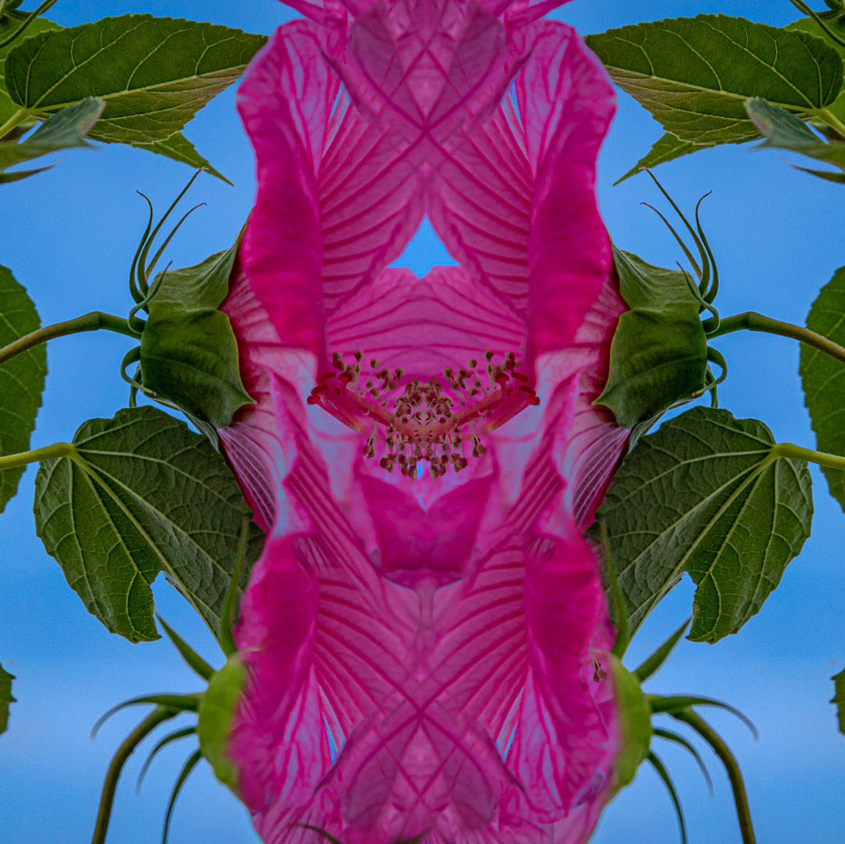 Bob, I find the colour of the flower against the blue (presume it's sky blue) very pleasing and the green leaves just complements the colour balance. My only comment about this image is to remove the out of focus bottom leaves and use content aware fill to create a more balanced symmertical image. To give you an idea, I've taken the liberty of using content aware fill and cropped into a square. |