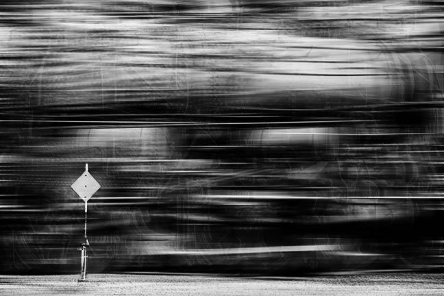 Hi Marta, good work on trying out multiple exposure, something I've not tried and can't imagine it would be easy. As the others have mentioned, the image offers a lot of visual textures and lines and so the eyes tend to wonder a little. Have you thought of building on your image and applying a motion blur to indicate "speed?" With the multiple exposure and the speed you have an very interesting image. Mask out the sign and that would give the viewer an "resting" point to focus on the speeding train. I've taken the liberty of giving an example of what I see in your image. |
