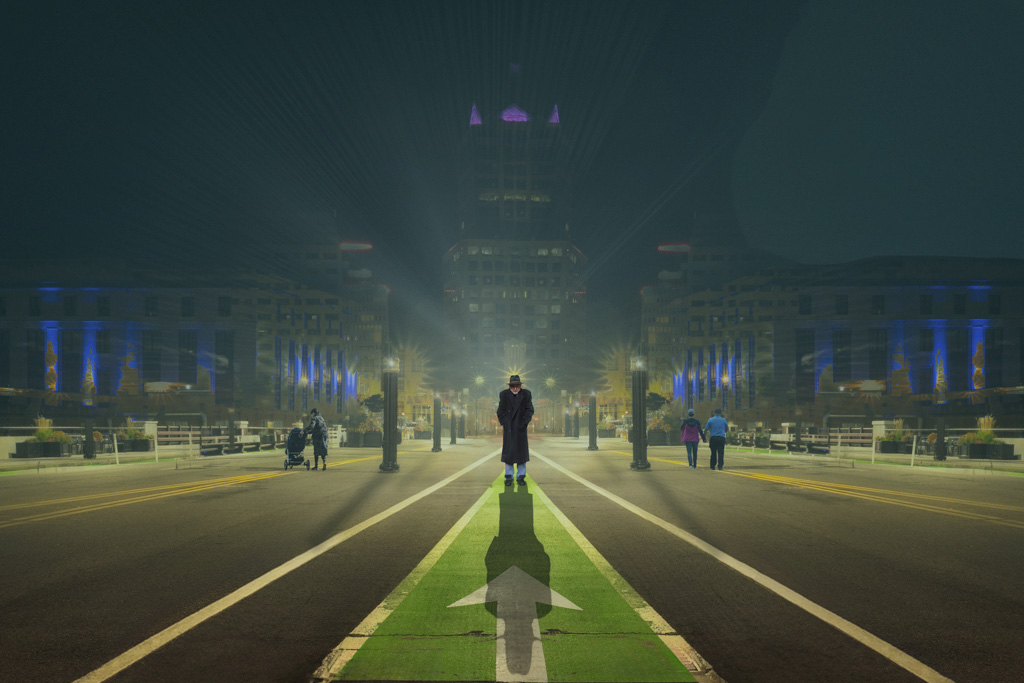 Tom, this is a great image and Brad is right, it feels like it's Gotham City at night. My only tiny suggestion would be: as you have haze already there, add some more "haze" in the background. This would make the figures on both the left and right side less dominant and make you stand out more. By the way, I like the star halo behind your head. Well done. Something like this. |
