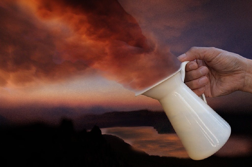 What a great idea Brad, I really like it. Personally, I would make the hand and jug larger and increase the amount of cloud coming out of the jug to fill most of the top part of the frame. I would also make a reflection of the clouds on to the water. Something like this. Nice job. |