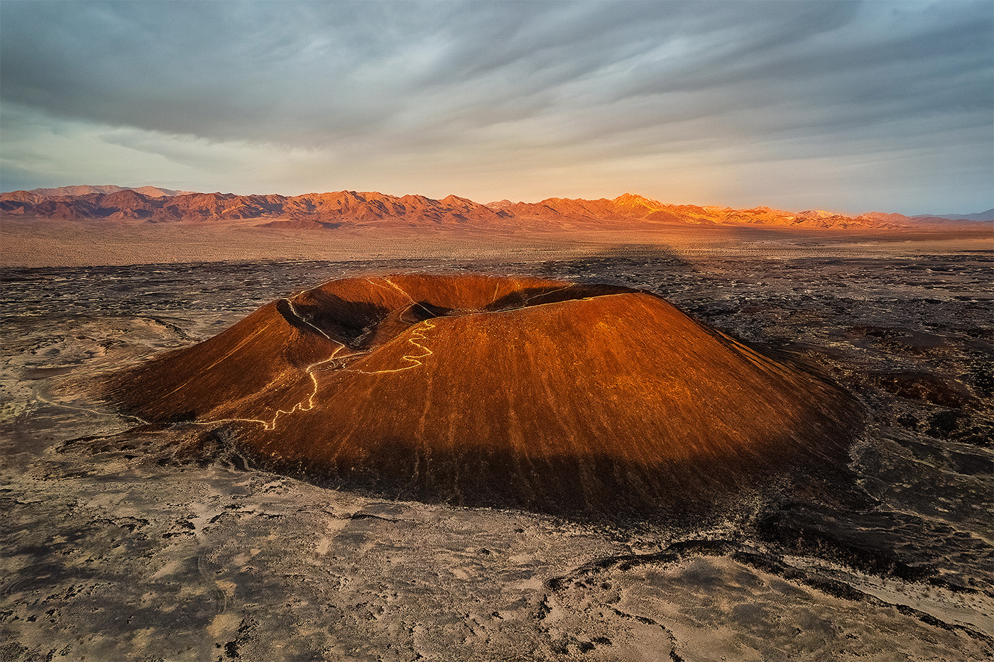 Five shot HDR from DJI Air 2S, around sunset. This is the Amboy Crater, a well known landmark along Rte 66 in the Mojave Desert. A lot of CAF and clone stamping to get rid of a road, railroad , freight train and a few buildings in the far background.