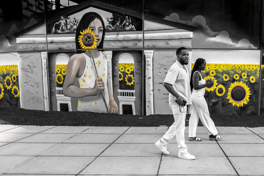 I really like this street scene, especially the two men in the lower right. I want to see more of the people in the lower left and feel like it cuts off too suddenly. I like seeing the store in the background. |