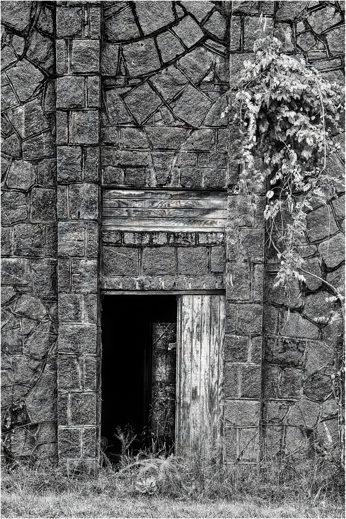 Ed..this is an intriguing image and I can understand what draws your eye. Overall, currently it is a bit flat and bland. I think the crop suggested by Stuart has some merit but I do like the intricate patterns in the stone work. I would consider darkening the image overall and let the bushes & two pieces of wood naturally stand out in contrast to the dark door. |