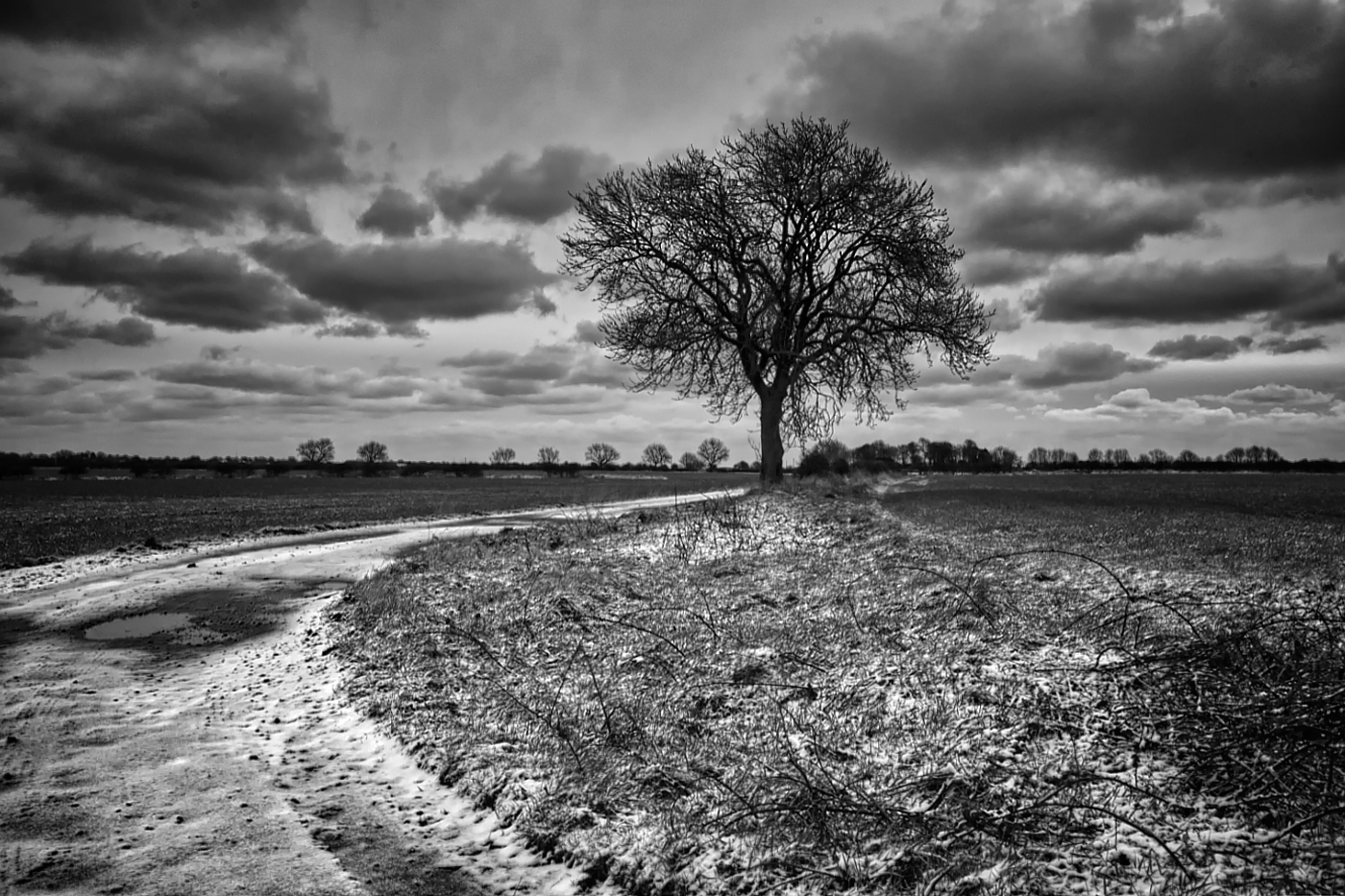 Hello John, I really like this image and feel it has impact. The composition is thoughtful with the leading lines, the central tree and horizon. Finally as you state, what is a landscape without some weather to add to the story. I believe it is worth while developing the image further in a more overtstated way (just a personal perspective) by adding a layer on the sky to darken and enhance the effect. On the overall images you might consider pushing and pulling the B&W's to increase the contrast to the sky. Lastly, you have more than 10 spots from your sensor in the sky that came more obvious as I experimented with your image. I attach a demo I tried to illustrate the direction & I hope it will help. |