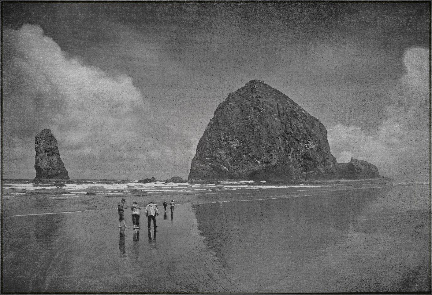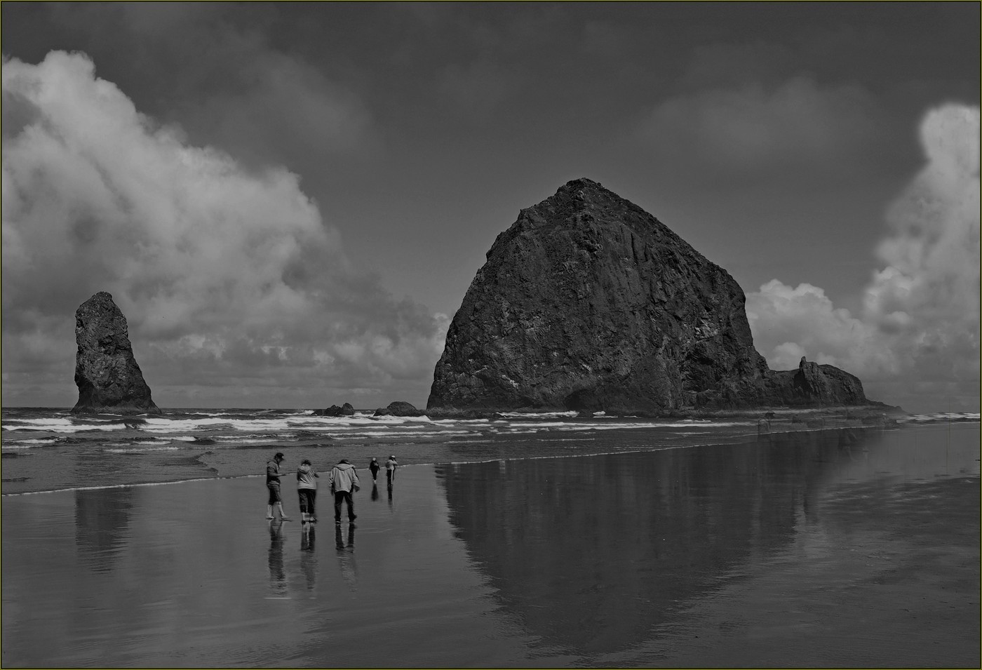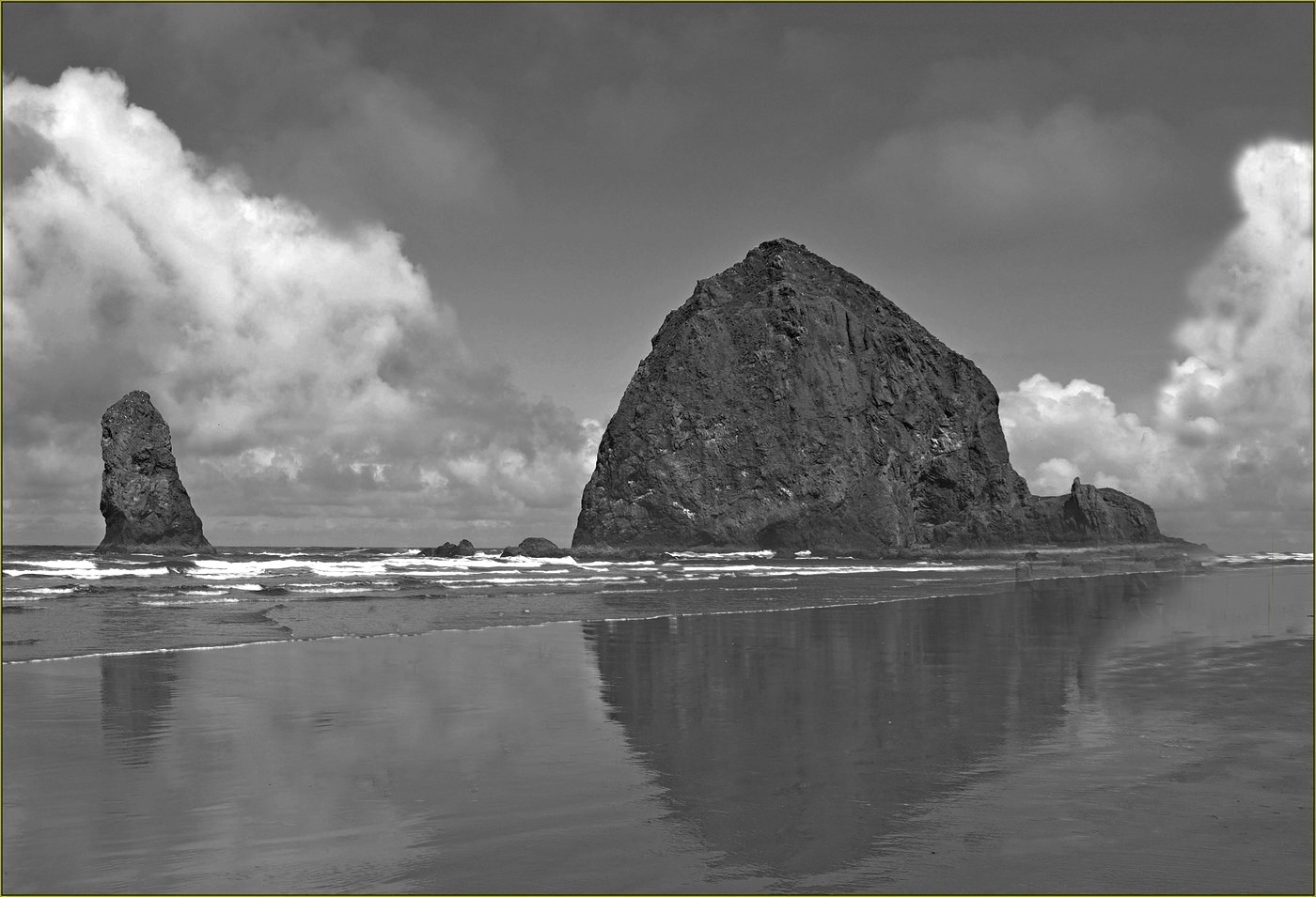 The sharpness of the rock is the first to notice and then follow the water entrance to the view of a building on the cliffs makes it a great image. The variety of blacks and whites here are well shown. Water, rocks and clouds, a complete picture.