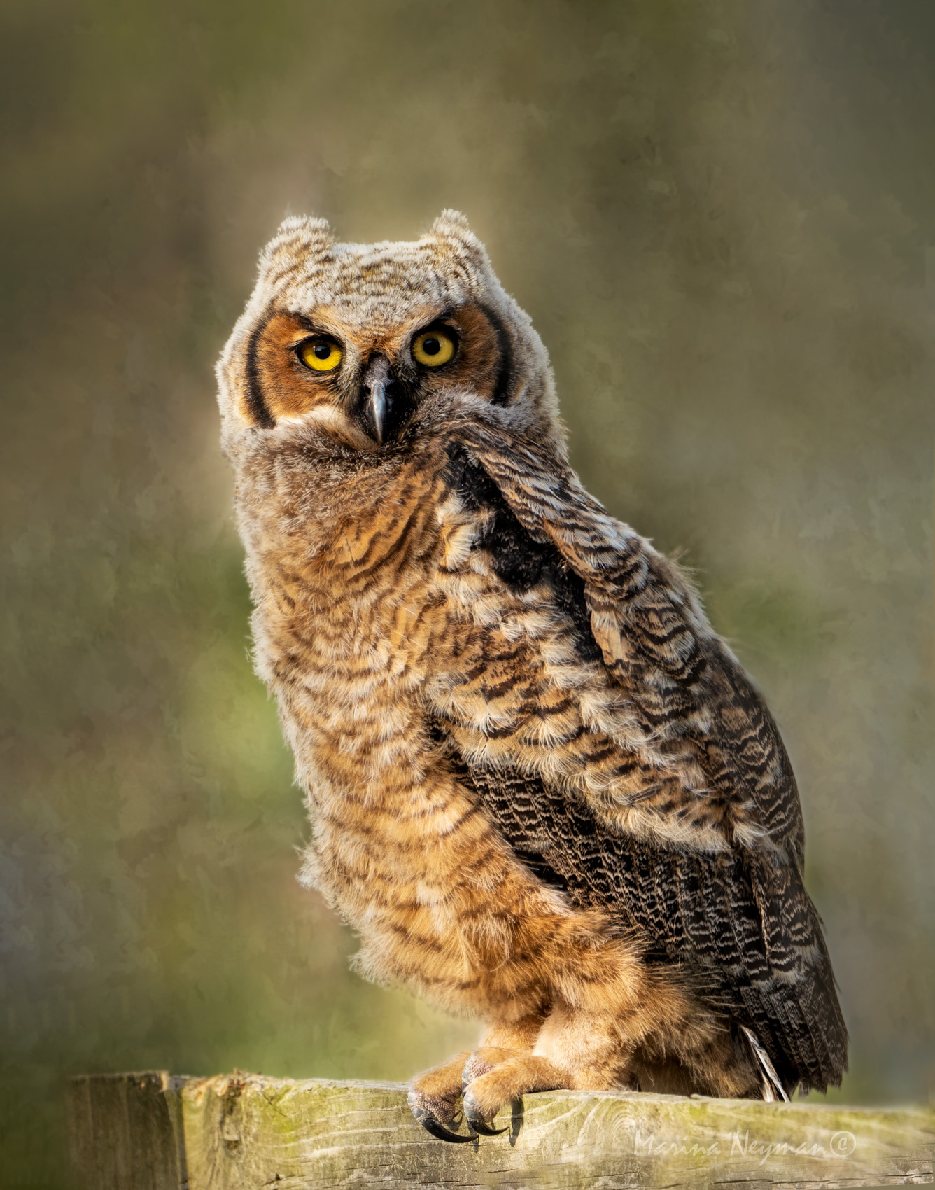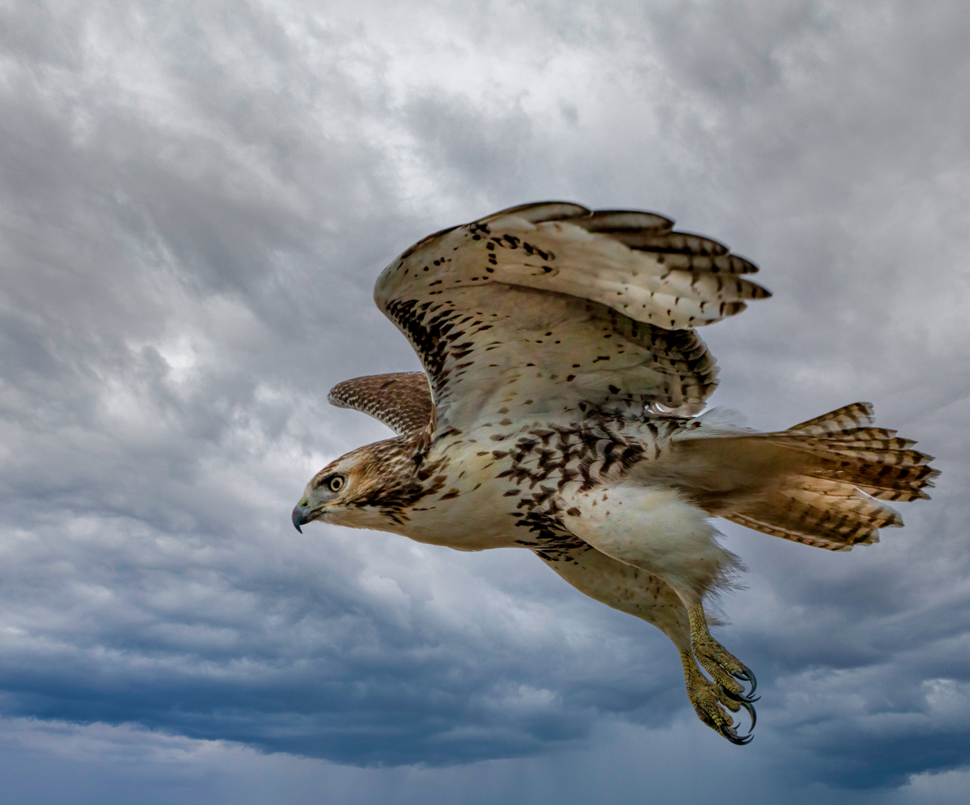 This is a great capture, decisive moment! I love open wings and details on the feathers. Square crop is a good choice for this image. For a bigger impact I would try to brighten the eyes, especially left eye. This bird stare is striking and I find myself looking at the eyes even more than at the feathers. |