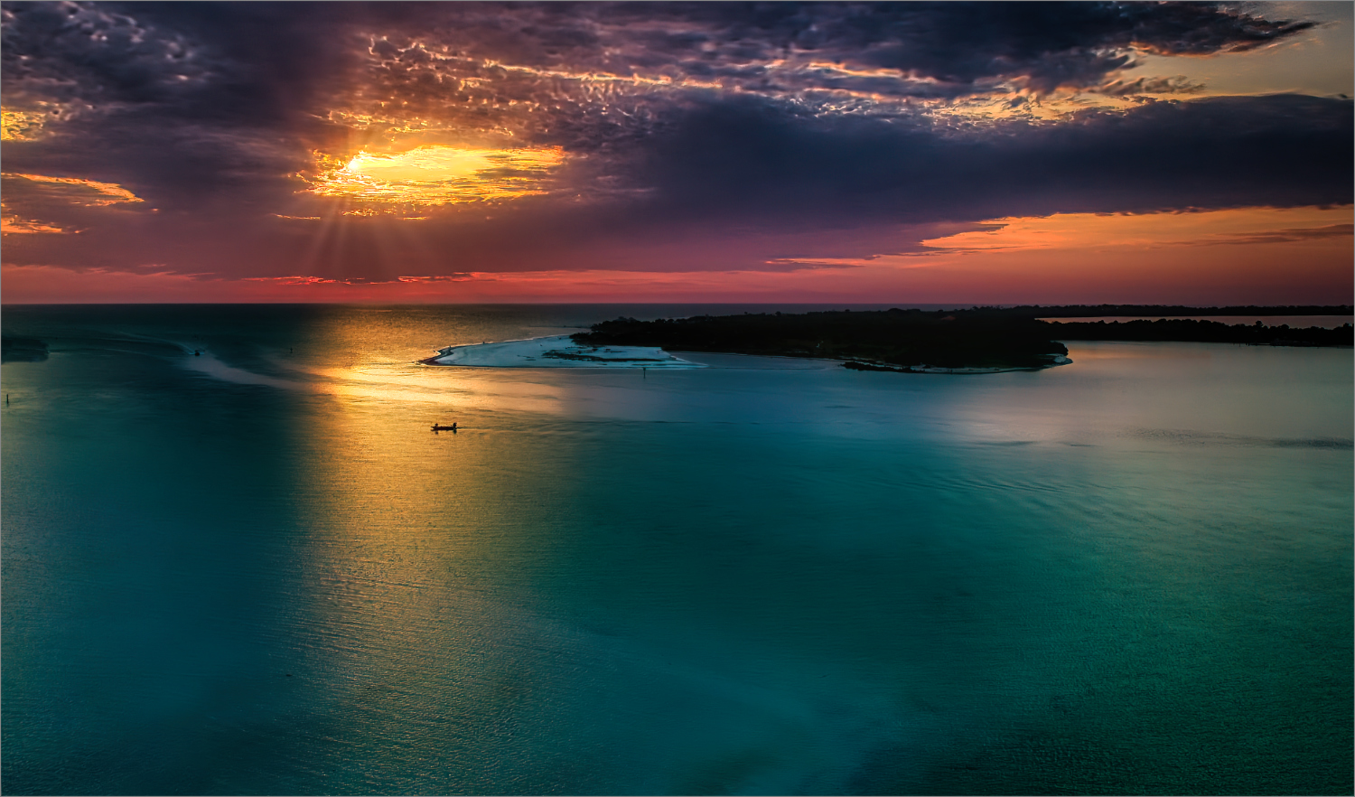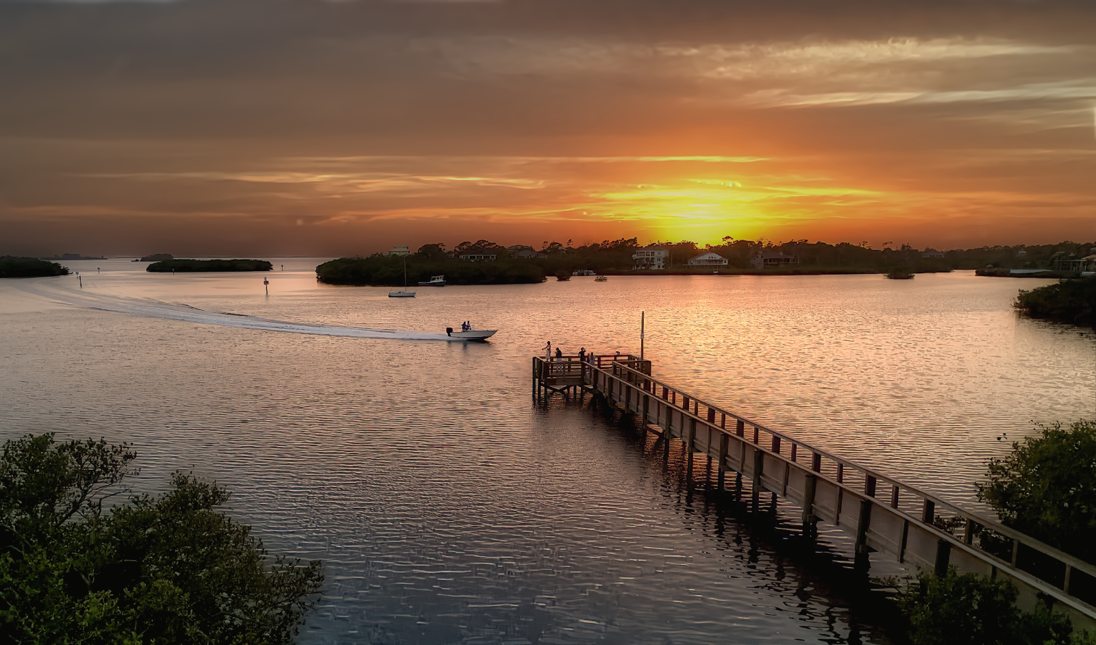 Fantastic shot, good focus and no motion blur. The trail of 'fire' on the water is very interesting- refraction and reflection. I might have cropped just a little off the left. |