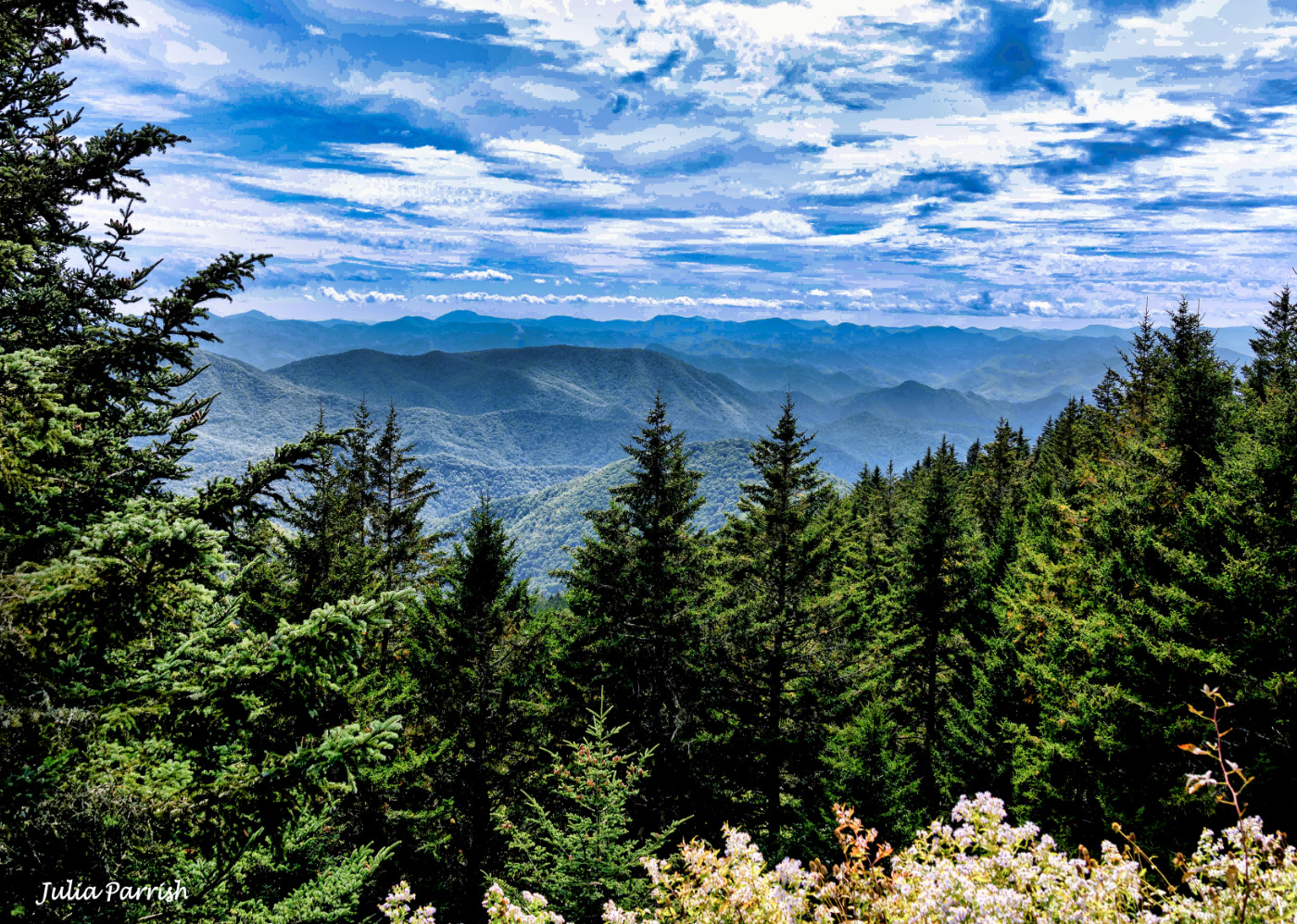 I have found that when I view a beautiful vista such as this one, a photo rarely portrays what my eyes see. The photo does have the mountains framed by the trees on the left and to a lesser extent on the right. I have taken the liberty of playing around with the image by cropping, enhancing the sky, and various other edits. I also changed the aspect ratio to stretch the vertical. The sky would be better if the original raw file was used. |