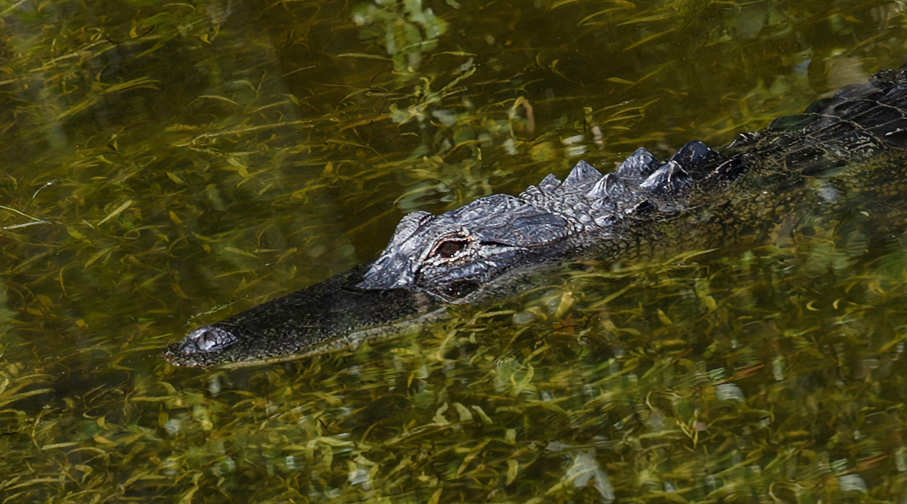 Nice gator shot, reminds me of the last time I played golf. I like the swirls of greenery in the water, the lighting, and the reflected image (esp the eye). I've attached another cropped version where mr gator is on a diagonal, don't know if it's any better just an alternate view. |