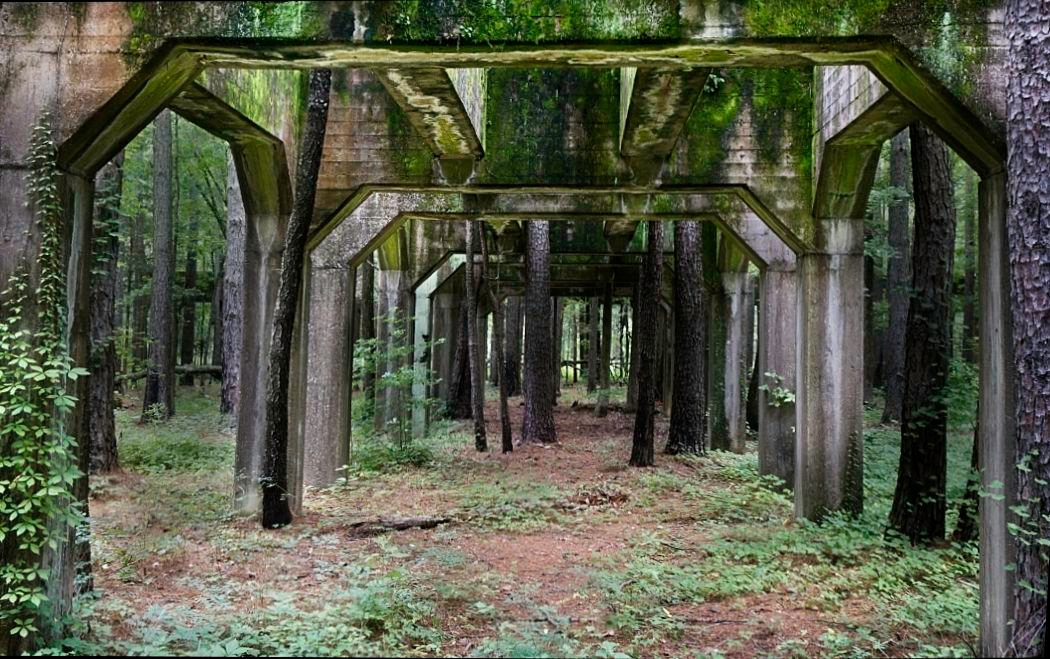 Interesting subject with the large trees surrounding concrete structures. Thanks for the history. To me, the image is a little flat with structures, trees and leaves tones blending into one another. Try separating the structures from the other stuff through tone and contrast adjustments. In my edited version, I have brightened structure shadows and toned down the surrounding trees and leaves via masking adjustments to highlight the subject (concrete structures. Also using ON1 software I have added a Sunshine filter to warm the scene and a Glow filter (to all but adjusted shadow areas) for added pop. Just an example of trying to bring out the subject. |