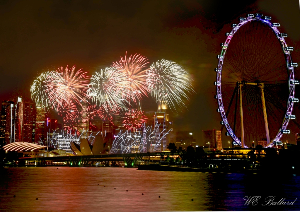 Nice fireworks image that is balanced with fireworks in center, Ferris wheel on right, and large structures on left. Thanks for providing camera settings. As an alternative edit, my version reflects cropping out the structures on the left and bringing down the top some to draw more attention to fireworks. It also includes brightening the city and Ferris wheel shadows a little for added detail. |