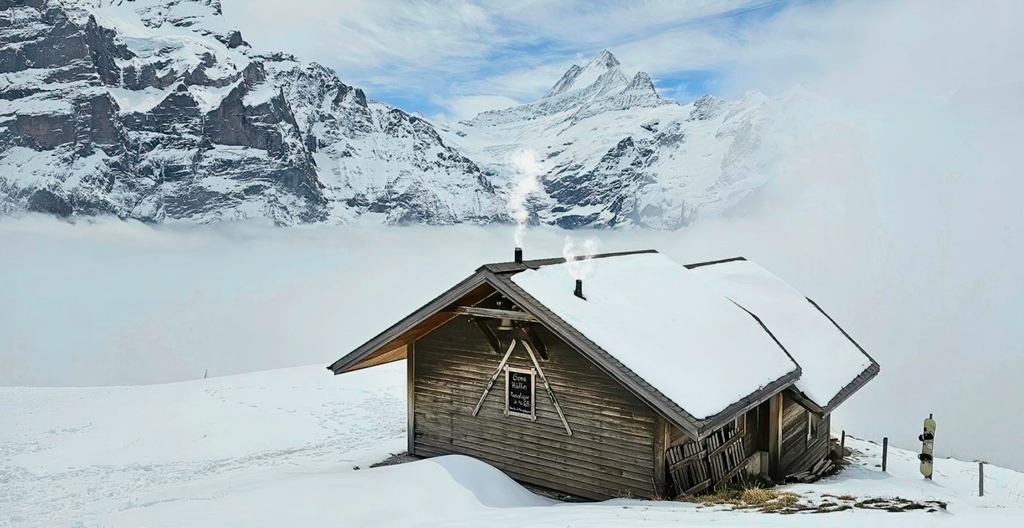 Really nice scene with the mountain cabin on the right, rugged mountain peaks with a little blue sky in the background, and a mid-ground of cloud/fog below the cabin. My only suggestions would be maybe warning up the cabin color a bit and toning down the white stack vapor which draws my eye first to it now. See my version. |