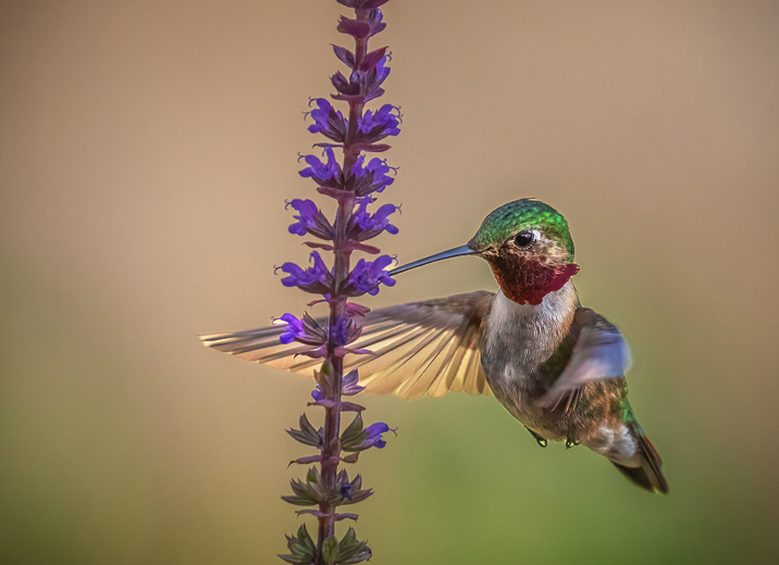 Hi Alley: I love your capture of this hummingbird. Your description of sitting outside with your big hand-held lens sounds like me. However, I have not been successful getting a sharp image. My first impression of this hummingbird was that he was fading into the background. I used my object tool to choose only the bird and then used curves on it. It made the contrast and colors really stand out. Then I used the brightness tool to slightly increase the brightness. I also like the closer crop to highlight the bird. I'm still a little distracted by the tan and green background but decided to leave it. What do you think? |