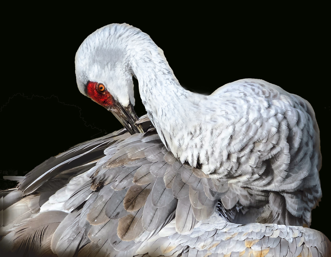 Hi Fran: I have been to Nebraska to photograph the Sand Hill Cranes. It is quite an experience to see that many cranes in one place. I love the cropped image of this bird. The detail is fabulous. I have taken a different approach to editing. I love to see a white bird on a black background. Then all you see is the bird with no distractions from the background. Once the background was changed, I needed to lighten the beak and the red area, so they better matched the original. I do believe your image is burned out because there is no detail in areas of the face and neck. For a piece of fine art, I will often clone other areas over the burned-out piece. Then I will reduce the opacity and try to blend the area. Once that is done, I will take the dodge tool to lighten it back down to normal colors. My crane developed a blue tinge, and I lessened it some in color balance. What do you think? |