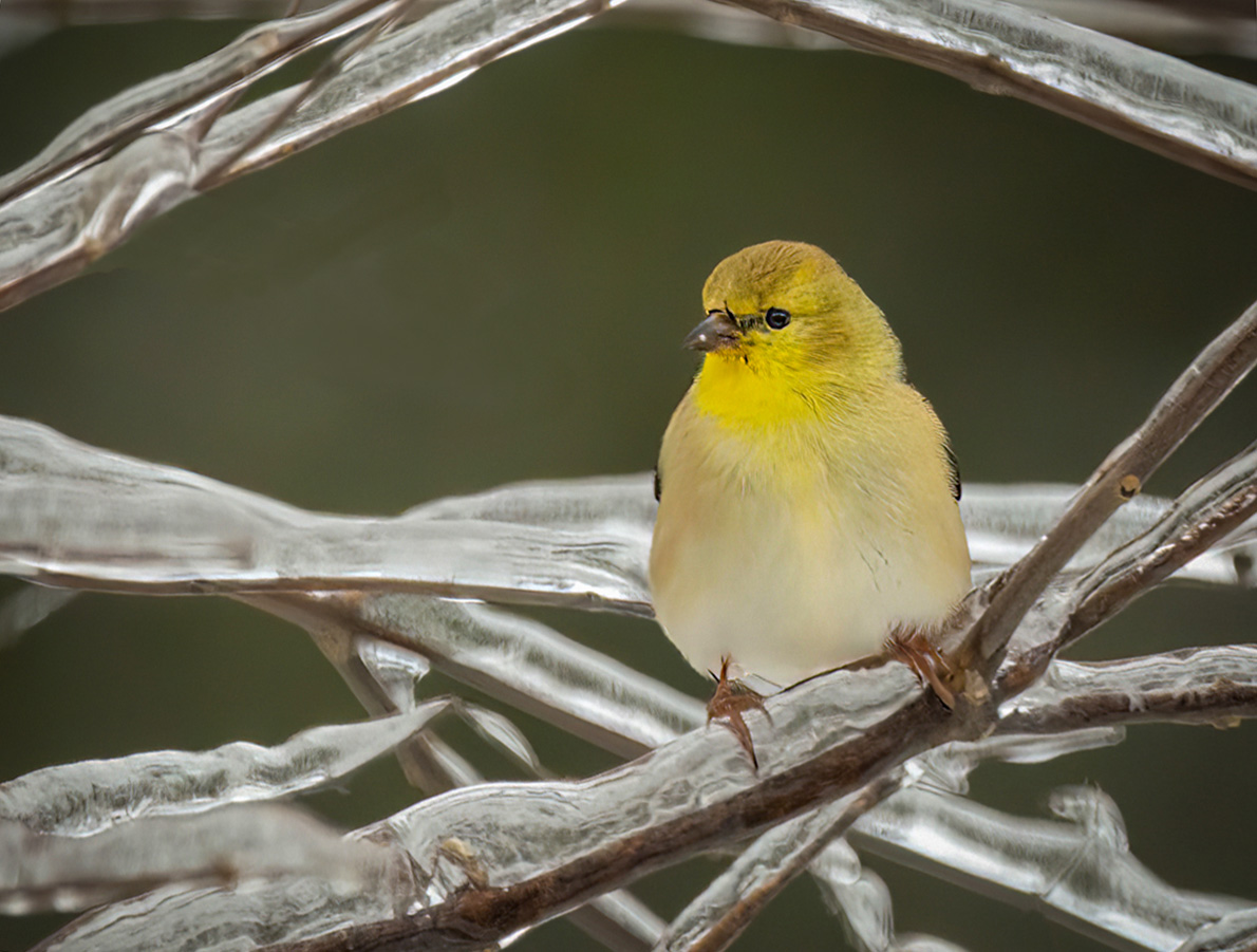 Hi Barbara: Sorry I'm late with my comments this month. I love this little yellow finch. We never see them in winter in Missouri. I bet he was in shock to see all the ice. I don't really know if I improved the image or not. I started with Carole's image which darkened the ice. I removed that nasty little branch, which was so distracting. Just for kicks, I wanted to see what would happen if I straightened the bird some. This cut the size of the image and brought the bird closer. I like the branches on top, which give a nature frame for the finch. I don't know. What do you think? |