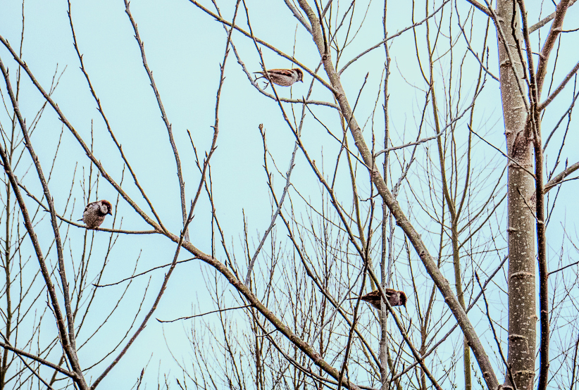 Carole: I love the baren look of the trees, which definitely say, "Winter." However, I did not like the bleak background. We have blue days in winter, so I changed the background to show a blue winter sky. Doing this lost the trees and birds, so I lightened the neutral colors in color select. I also cropped so the birds became larger to see. As for the bird that's taking off - it's still looking down. I think it follows the old adage, "The early bird gets the 'winter' worm." I think these changes made it a more interesting image. What do you think? |