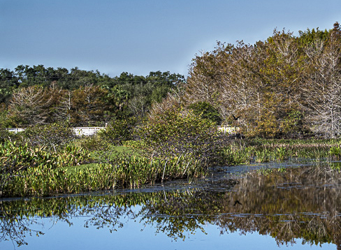 Hi Howard: This image just did not draw me in. Personally, I don't like groups of leafless trees. I find them boring. I cropped the image way down to eliminate some of the leafless trees. You mentioned the boardwalk, so I tried to make it the subject. I brightened it by using the dodge tool. Then I eliminated the clouds, which seemed to demand too much attention. Perhaps this is too small for the number of megapixels left, but I prefer this image. What do you think? |