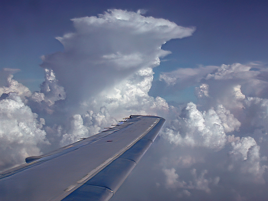 Hi Carole: These clouds do look like they are ready to brew up something. So, there is a feeling of anticipation. No flyer wants to travel through dangerous storms to come. I do like Connie's contrast, but I would like to see it grayer in the sky and on the wing. It is too blue for me. Grays would make it more ominous.