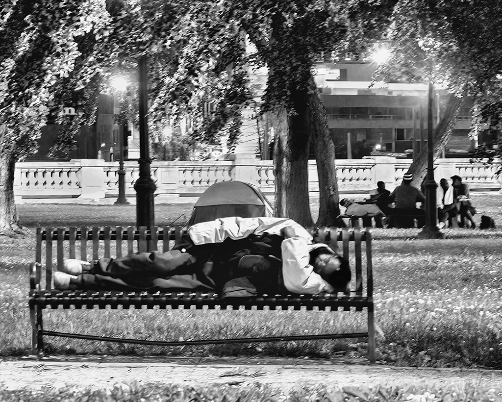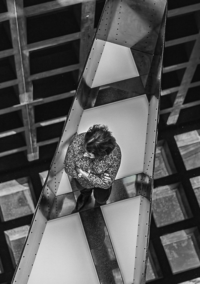 Hi Ally: The first thing I thought of this image was that this is "art." I think it's unanimous that Joan's twist put the bridge in a perfect position. Personally, I love the B&W image. In the color one, I am really distracted by the diagonal line leading up the lady, and also by the blue color. I took the image back into Nik Silver Efex, and I lightened the woman, cropped a small amount off the bottom and darkened all the light areas in the black bars and the distracting artifact in the blue. I think this makes the woman the subject in a good balance. |