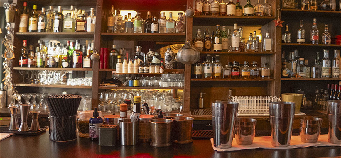 The lights are distracting to me, so I cropped them out and used the perspective tool several times to try and straighten the shelves. The subject now changes to the things on the bar. The image becomes a panorama. It's just a different perspective on the same image. I think I still like yours best. Maybe you can just tone down the lights so the eye isn't drawn to them.