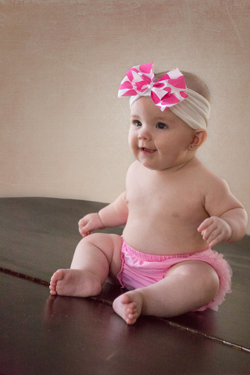 A Ba-by! How many times have you seen someone go gaga over seeing a baby? That's JOY. You certainly captured her cuteness. I can just picture her wiggling and bouncing. The background looks a bit plain to me. She calls for something more to compliment her personality and outfit. I used a quick background texture by 2 Little Owls with a Softlight Blend Mode..just a touch of pink. |