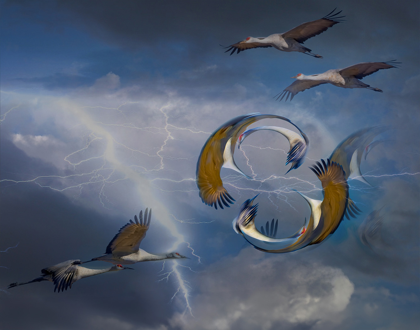 The texture and sharpness on the 2 birds flying makes them a strong subject. The white birds make them an excellent subject for Black and White. As Kathryn suggested, I would like to see the 3rd bird and extraneous signs removed. As I begin to look at the photo, my eye goes first to the background and then the birds.By cropping down on the top and bringing in the right a bit, the viewer would focus directly on the birds. |