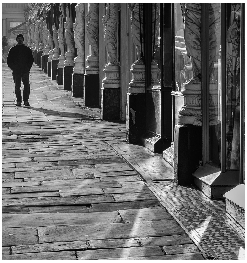A wonderful photo of lines and shapes and tones and textures. I agree with the others to lighten the shadows on the man a bit. Because I am so intrigued with the columns on the diagonal, I might try cropping on the right so that the car reflections are no longer there. They fight with my eye continuing on the diagonal. A wonderful Black and White. |