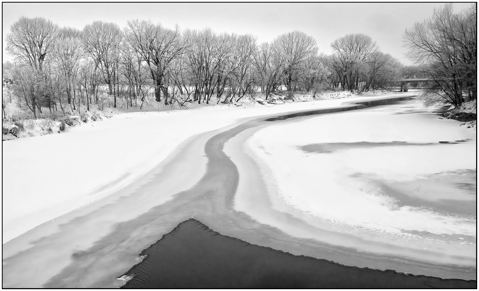 I like the leading lines of the snow and ice right to the bridge. The different tonalities of the ice add to the Depth of Field. Two minor suggestions.... How would it look if you cropped in on the left to begin at the line of the taller trees. My eye gets distracted by the line of shorter trees, then taller trees. And I would clone out the footprints on the right. I find them a bit of a distraction.Here it is cleaned up. What do you think? |