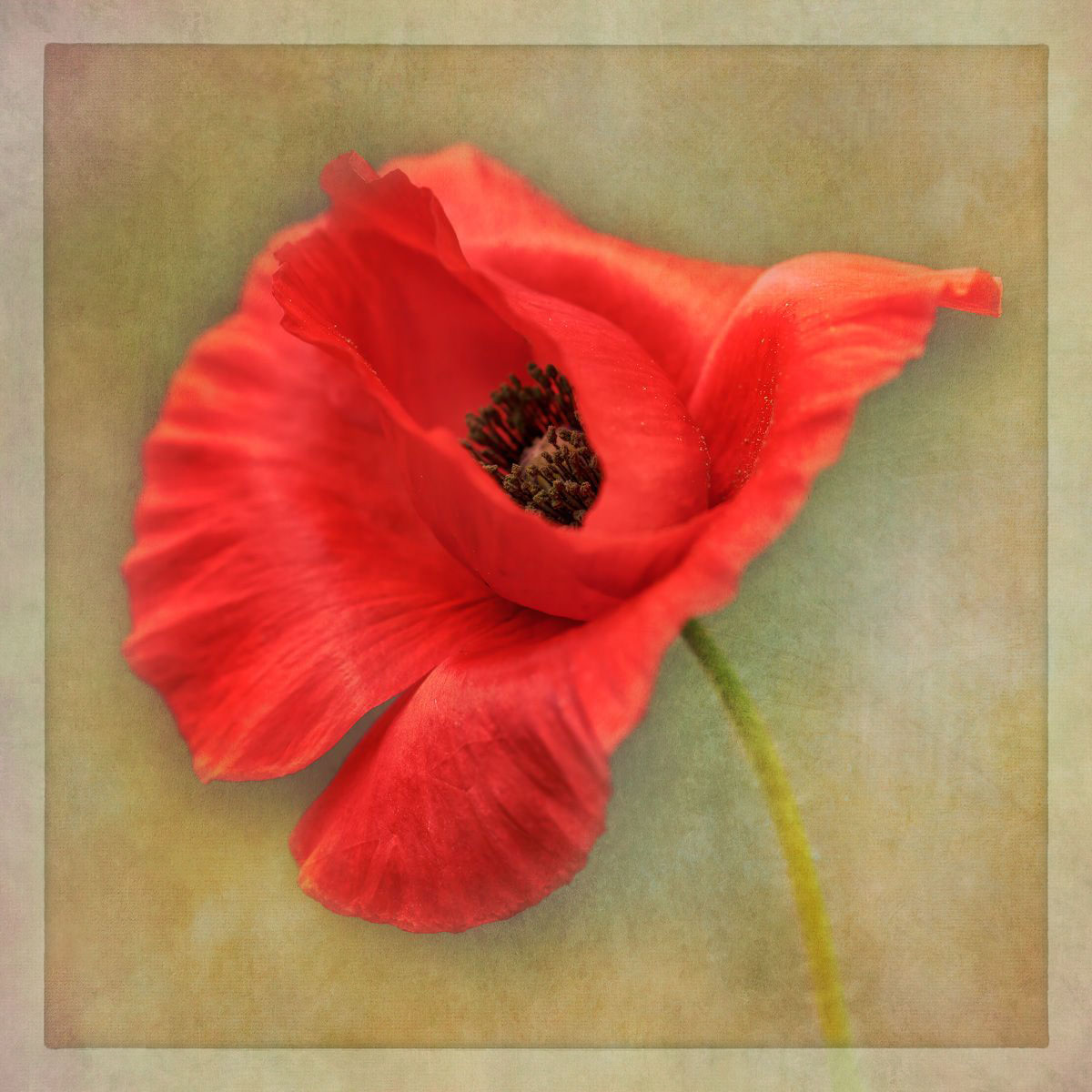 I like the softness of and tone of the poppy. Red is a difficult tone to get right (for me at least). While I like the idea of using a texture, I am not sure about using one with so much orange and yellow. I took the liberty of adding a soft green texture to it at 60% opacity. It softens it but keeps your tonal variations. What do you think? |
