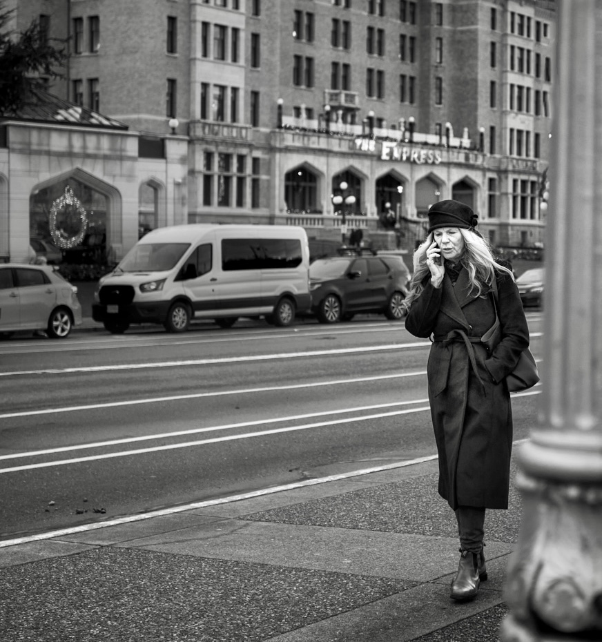 Street Photography is always challenging...a subject that intrigues me, as it intimidates me. When I first saw this title, I thought she was the Empress...than I saw the hotel marquee in the Background. Wonderful tones and storytelling. I find the pole to be too close to her and distracting. Did you try to crop in a bit on the right? I don't think it takes away from the Story. Or you could try to move her a bit to the left in PS, using the Move Tool. I tried just a crop, then the sky separating the pole and the building was distracting, so I cloned it out. Also brought the Empress sign a little more into focus. What do you think? |