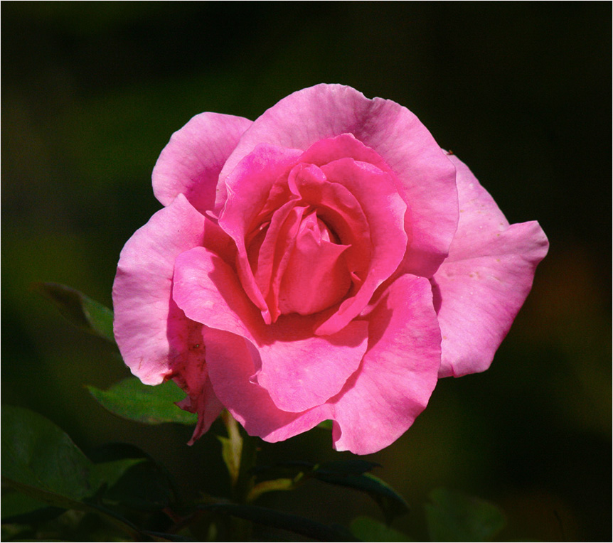A very vibrant pink rose, for my taste I would tone it down a bit. To do this I have added a B&W layer, just on the flower, put it in lighten mode and at 50% opacity. I have then adjusted the shadows and highlights and darkened the background. Also I suggest removing the blemishes on the flower. Like the others I think the texture on the background is a bit heavy and detracts from the rose and the stem looks out of place. |