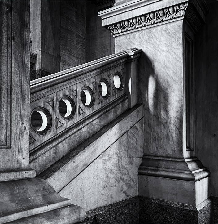 I love the shapes and textures in this image and it suits the conversion to mono. I would agree that some of the shadow areas need lifting a bit. I wondered about a slightly different crop to keep the shape of the pillar on the right, see image. I converted to B&W using Nik Silver Efex. |
