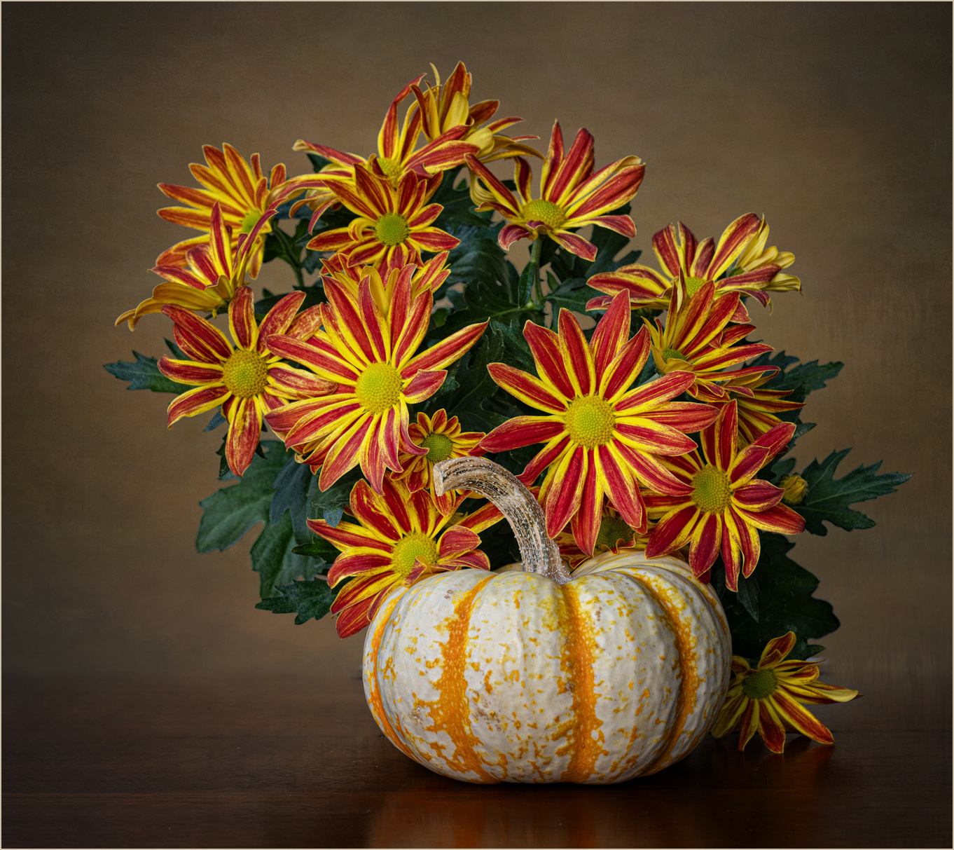 A lovely autumn still life Denise. For my taste I find the texture a bit heavy and would prefer something a bit softer. I also find the composition a bit tight in the frame. I had a bit of a play and attached is my approach on your great arrangement. |
