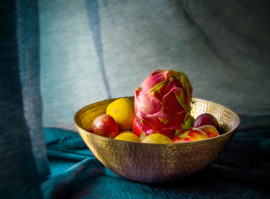 A very well composed still life image. I really like the shaping in the drapes. Like the others I prefer the colours in the original image and would just lift the shadows on the bowl.