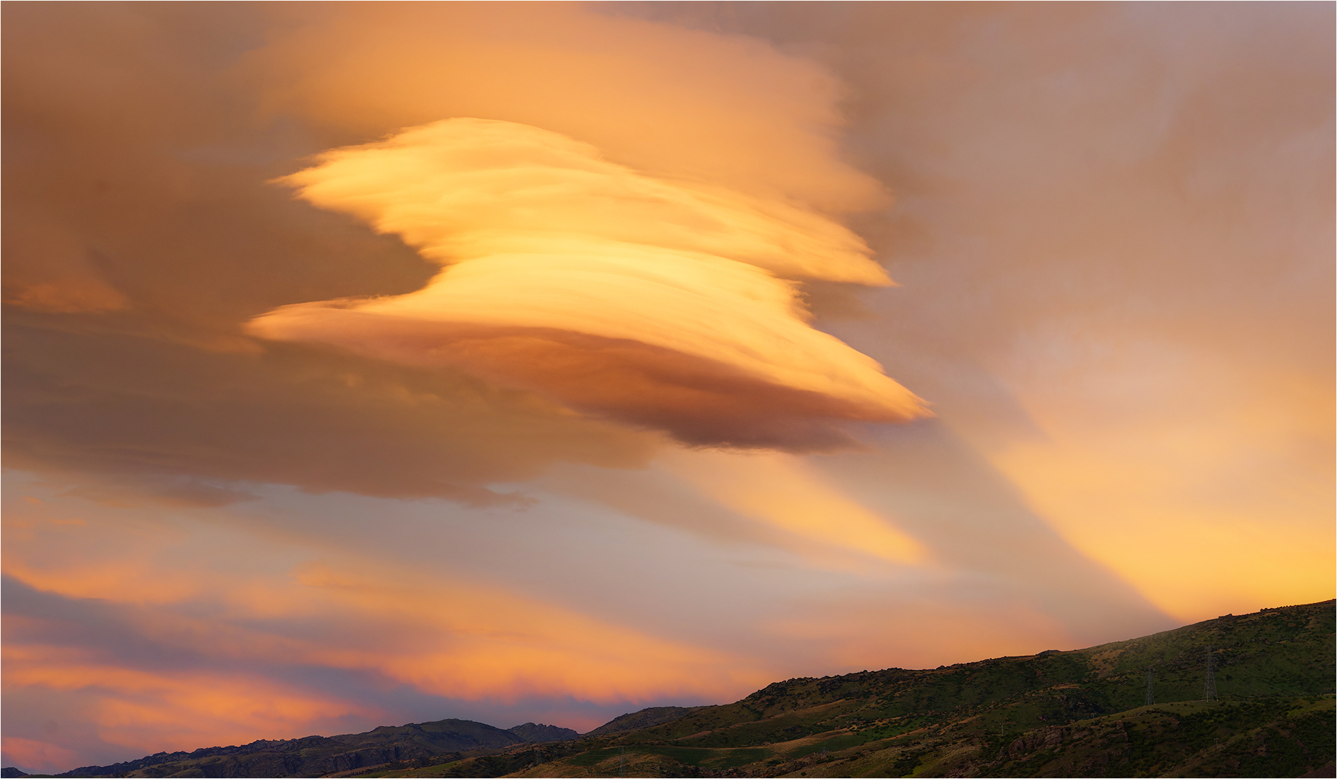 Hi Mary, you have captured a fantastic cloud formation with some wonderful light. Like Denise I prefer to see some light on the hills and for my taste I would keep the overall image a bit lighter. I have had a little play with the original in Photoshop to try and emphasise the cloud formation a little more. I cropped a bit off the top of the image, lightened the really dark band of cloud on the right by painting over it with the adjacent colour at a low opacity and then in Camera Raw I reduced the clarity of the sky, masking this off the cloud formation. |