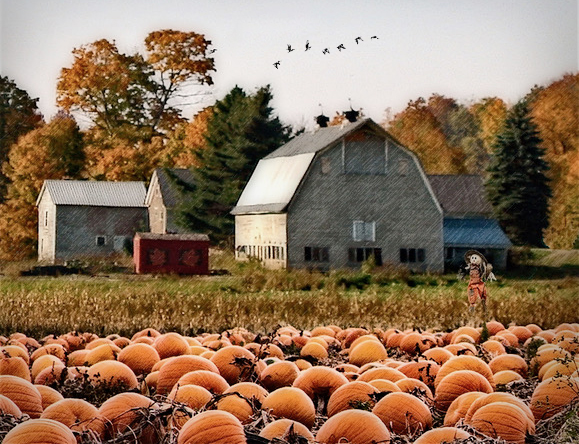 I like the original image and the treatment to give it a more sketch like feel. The addition of the birds help fill some space in the bland sky but I might be tempted to crop off more of the sky and change the position of the birds, so they seem to fill more of the space (as attached). The scarecrow seems a little lost against the building behind and the pumpkins seem to dominate the image, so perhaps fewer of them and angling them slightly as Denise suggested. |