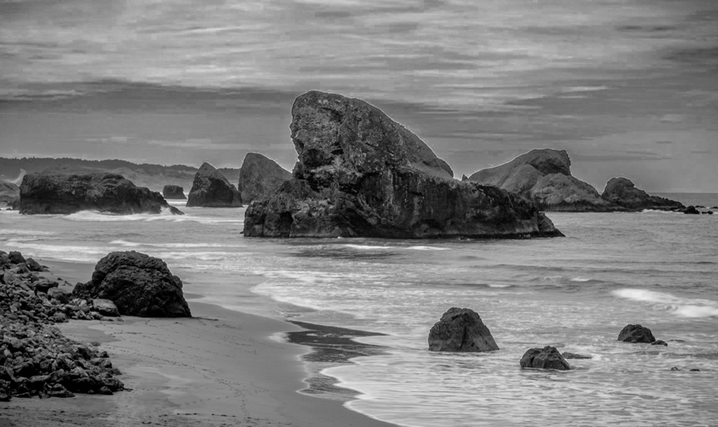 Fran this makes me nostalgic for Oregon. I like the rocks and agree with David's comments. Always check your horizon lines😎. I was wondering how this would look if you took out some of the sky and made the story more about the rocks. I took the original colour and somehow from my screenshot cuts off the birds but this give you an idea. Also you could make the sky/clouds more dramatic and lift the shadow of the rock on the left. I would have like more beach to the left as well.