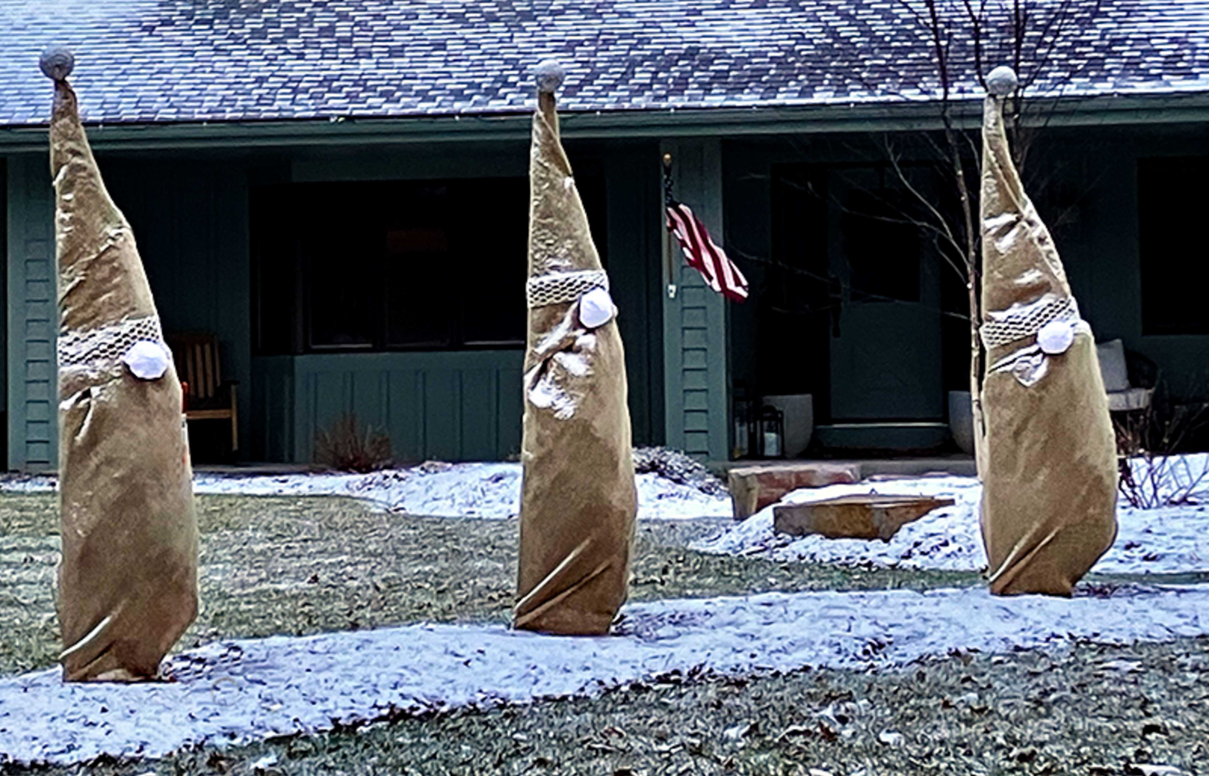 Very creative way to care for evergreens as well as giving you a creative opportunity with the photograph. My only question is what would it be like if you cropped more closely? I did that, darkened the shadows and highlighted the gnomes. Not sure. |