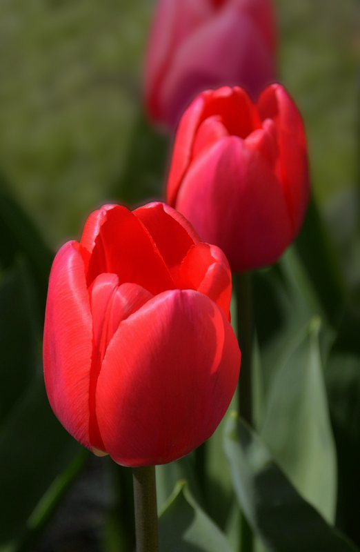 Jesse-You have a lovely image of Red Tulip. To improve this image further I would first remove black shadow on the leaf and blend with leaf color then I will make a selection of green background including last tulip and blur it to your taste.