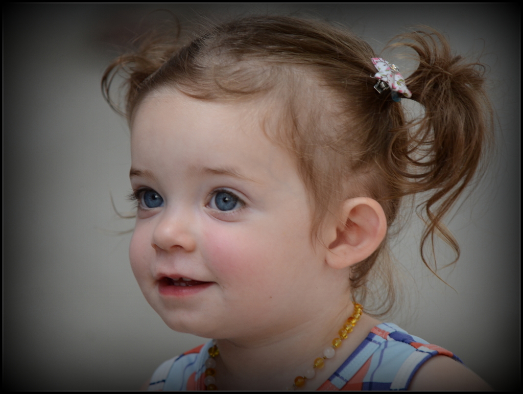 Jesse-You did a good job!Nice expression, pretty sharp all over, skin tone is natural and looks perfect. Yes, to further improve I would leave more space on top and I would repair catch light in both eyes to make in round shape in PhotoShop as shown with my comments.