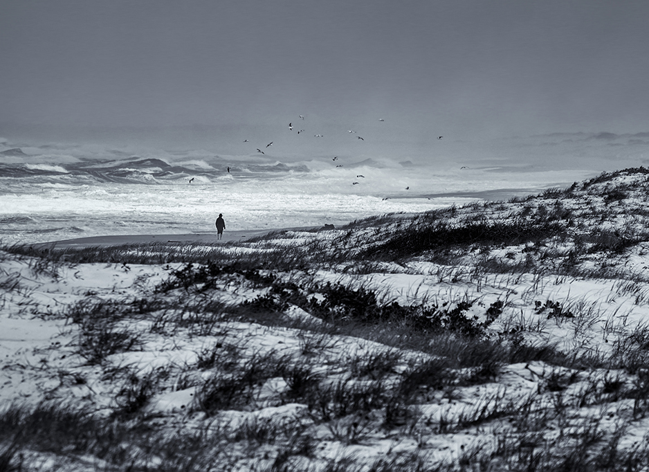Hi Terina- I agree with the others about the appealing starkness of the image. And I also agree that cropping could help strengthen the image by drawaing more attention to the beach walker and birds. (see attached) But I really do like the image and the feelings it portrays.