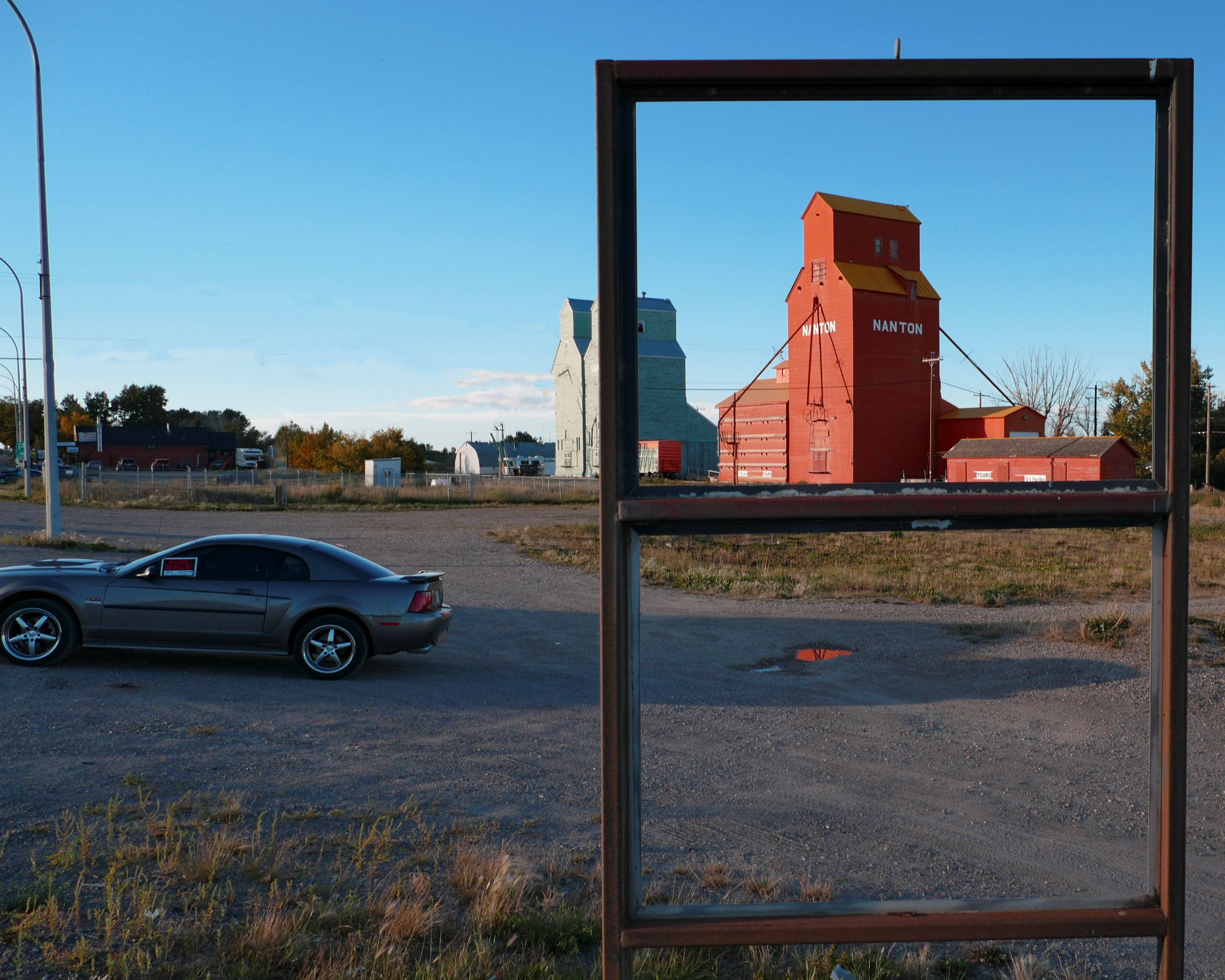 Thanks so much for the comments. Pierre mentioned that it would be better if the buildings could be better framed. I agree, but that wasn't possible. A fence around the property prevented me from getting directly behind the sign. Here's the awkward angle I had to take the photo from and then had to crop to get the final image. |