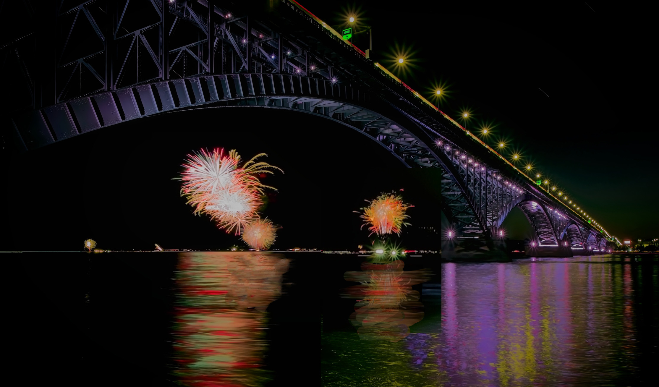 I love the idea of the bridge and the fireworks together- both are very eye-catching- and I'm fascinated by the technology in your camera. My only thought that that the fireworks seem overpowered by the bridge, and I wonder if the fireworks were more prominent if the picture might seem a little more balanced. I experimented by enlarged a couple of the fireworks to make them take up a larger space. See what you think. But for a first effort with a new camera, great work!